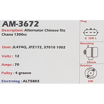Alternator Chana 1300CC 1.3L 12V 70A JL474Q