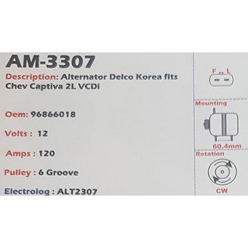 Alternator Chrysler 3.3L - 3.8L V6 (6-cylinder) 12V 160A - AM-3361