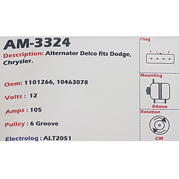 Alternator Chrysler 3.3L - 3.8L V6 (6-cylinder) 12V 160A - AM-3361