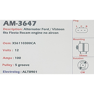Alternator Ford Fiesta Petrol (ROCAM-ENGINE) 12V 100A - AM-3647