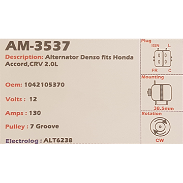 Alternator Chrysler 3.3L - 3.8L V6 (6-cylinder) 12V 160A - AM-3361
