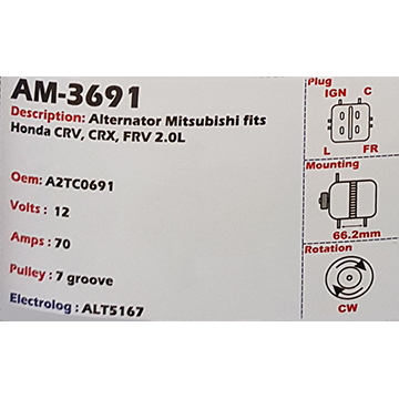 Alternator Honda CRV - CRX - FRV 2.0L 12V 70A A2TC