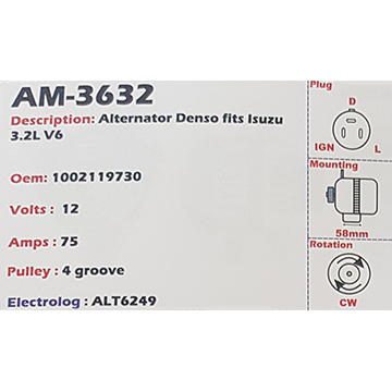 Alternator Chrysler 3.3L - 3.8L V6 (6-cylinder) 12V 160A - AM-3361
