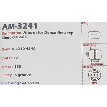 Alternator Chrysler 3.3L - 3.8L V6 (6-cylinder) 12V 160A - AM-3361