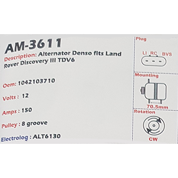 Alternator Chrysler 3.3L - 3.8L V6 (6-cylinder) 12V 160A - AM-3361