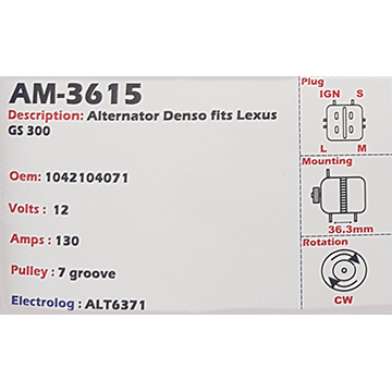 Alternator Chrysler 3.3L - 3.8L V6 (6-cylinder) 12V 160A - AM-3361