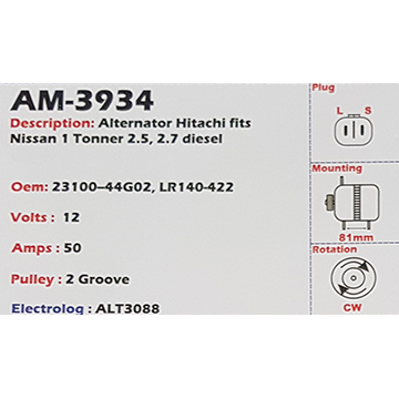 Alternator Nissan 1-TON Diesel 2.5L - 2.7L 12V 50A