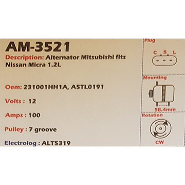 Alternator Mitsubishi Outlander 12V 110A A3TG - AM-3504