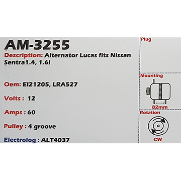 Alternator Nissan Sentra 12-VALVE 1.4L - 1.6L (1994-Onwards) 12V 60A AS123