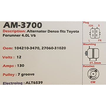 Alternator Chrysler 3.3L - 3.8L V6 (6-cylinder) 12V 160A - AM-3361