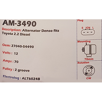 Alternator Suzuki Ignis - JIimny - Swift 1.3L - 1.5L - 1.6L 12V 70A - AM-3600