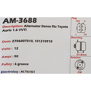 Alternator Toyota Auris1.6L VVTi 12V 90A