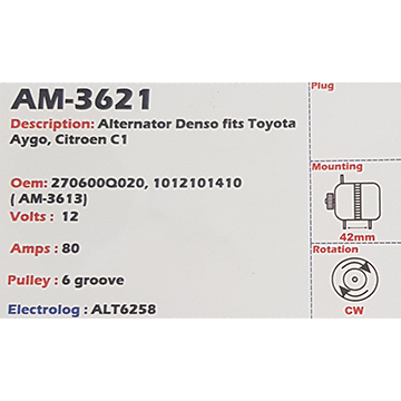 Alternator Toyota Aygo/ Citroen C1 12V 80A - AM-3621