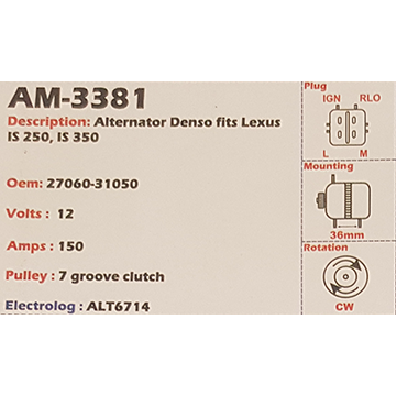 Alternator Chrysler 3.3L - 3.8L V6 (6-cylinder) 12V 160A - AM-3361
