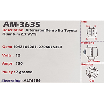 Alternator Toyota / Lexus 4.0L 12V 100A - AM-3380