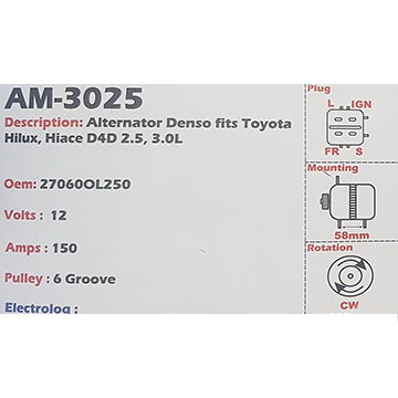 Alternator Toyota Hilux / Hiace D4D 2.5L - 3.0L
